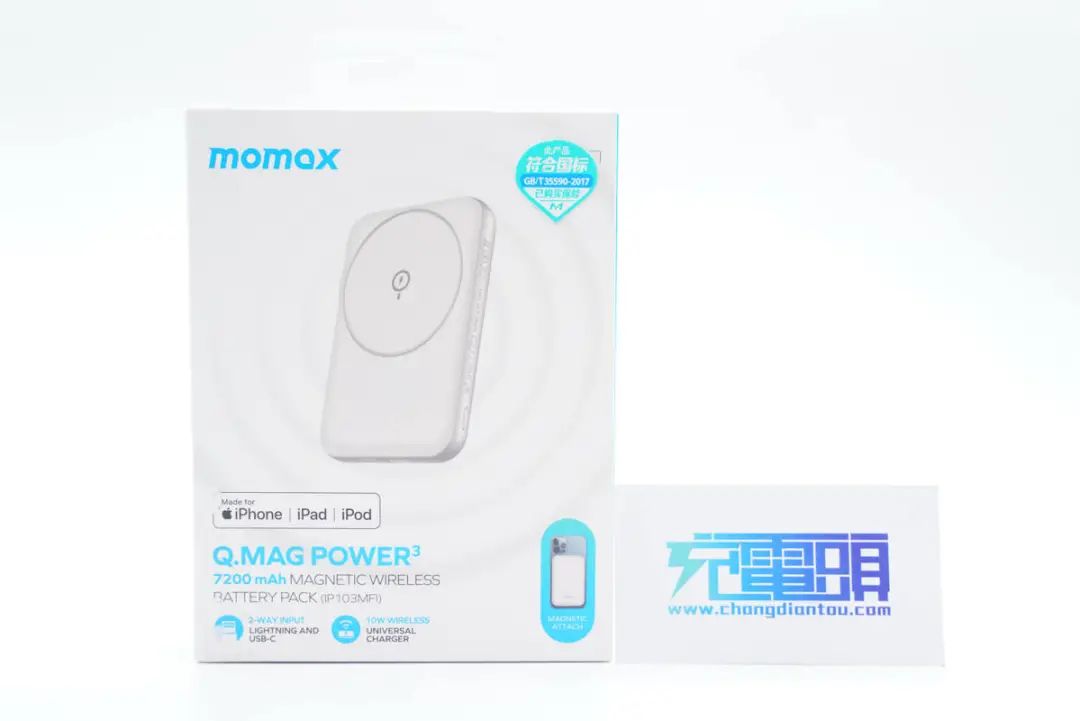MOMAX摩米士Q.MAG POWER系列磁吸無線充移動電源有多個款式,為蘋果iPhone 12/13手機用戶提供豐富的選擇。最近充電頭網就拿到了該系列7200mAh磁吸無線充電移動電源IP103MFI。