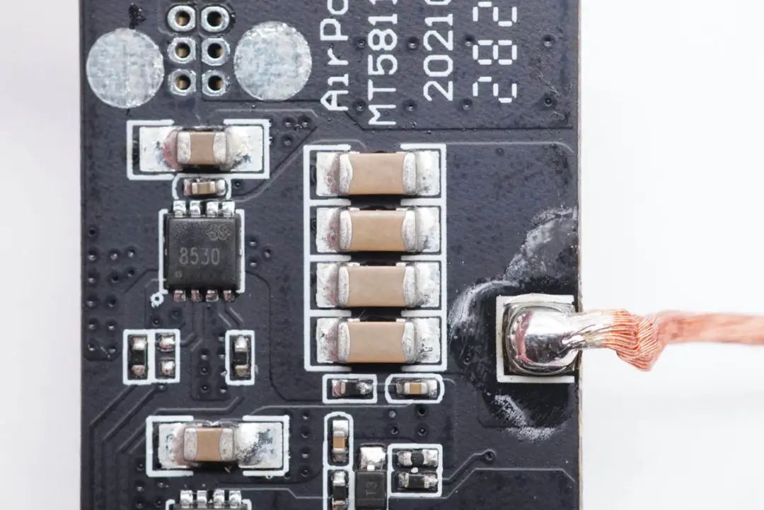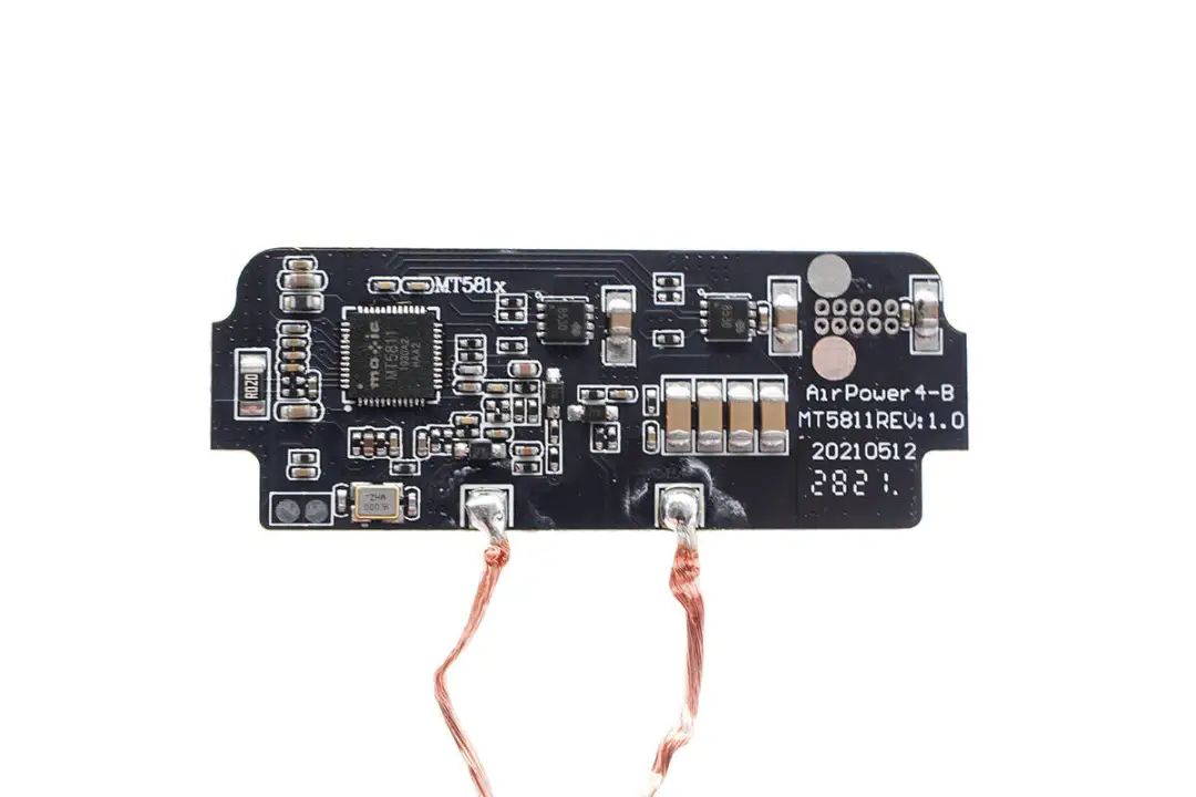 上層小板是無線充電路板,正面設有無線充電發(fā)射芯片、MOS管以及NPO諧振電容,并焊接無線充電線圈。