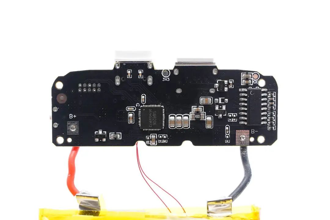 移動電源主控芯片采用智融SW6206。這是一款高集成度的多協議雙向快充移動電源專用多合一芯片,支持A+A+B+C+L口任意口快充。其集成了5A高效率開關充電,22.5W高效同步升壓輸出。