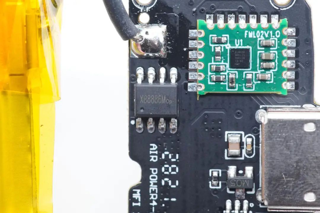 Lightning輸入口旁邊一顆芯片焊接在綠色小板上,絲印610A38,用于MFi認證。