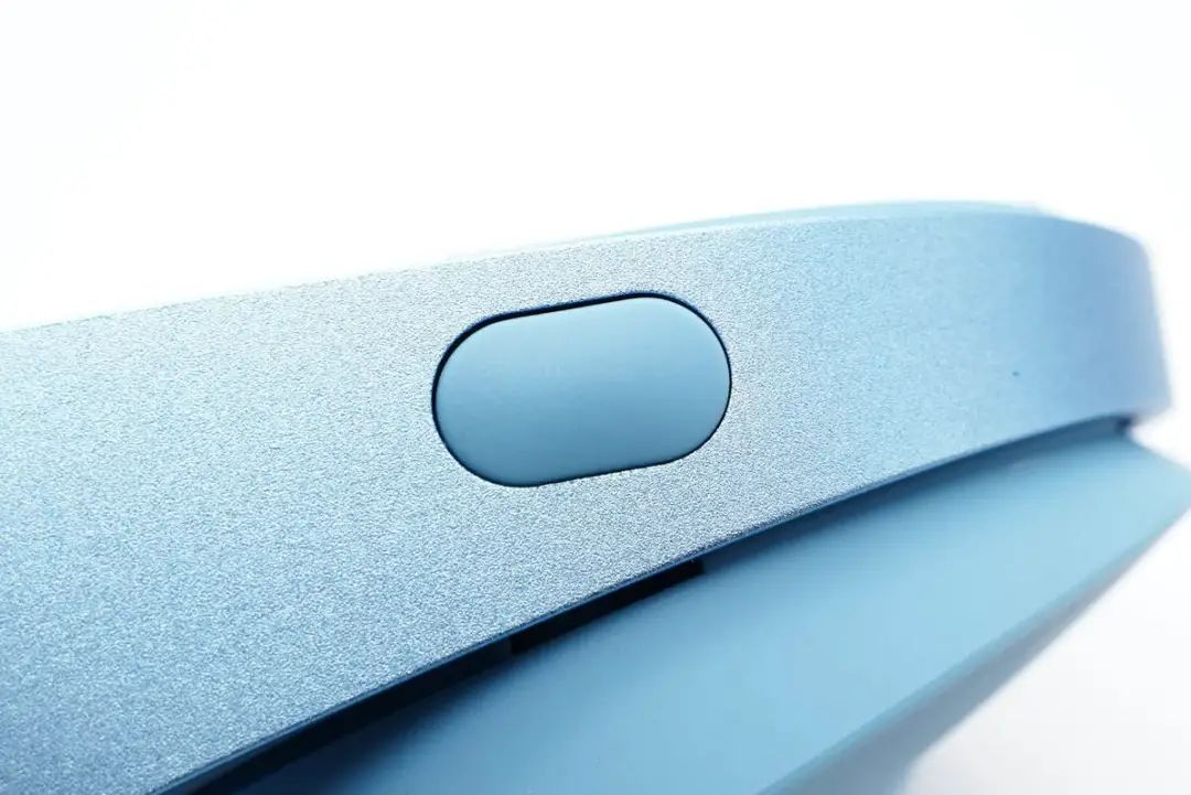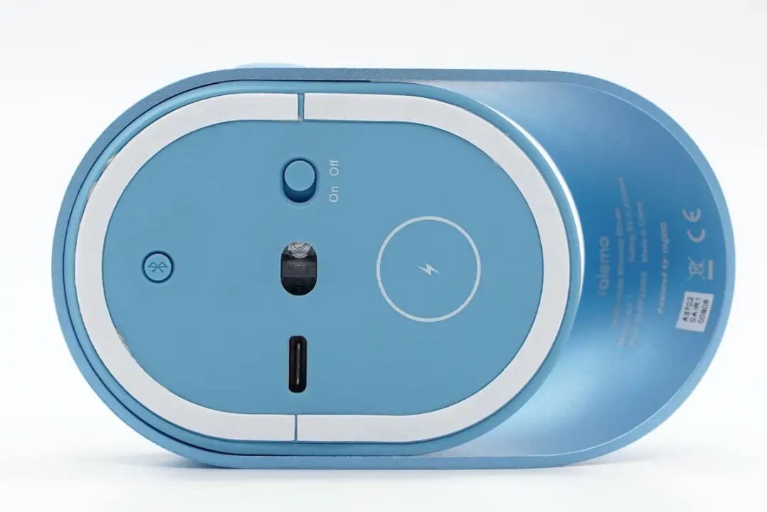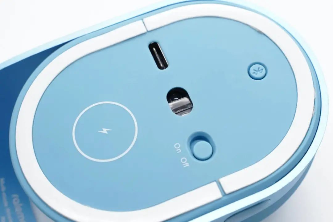 鼠標(biāo)底部邊緣貼有白色聚四氟乙烯腳墊,兩端分別是藍(lán)牙鍵和無(wú)線(xiàn)充電標(biāo)識(shí),兩側(cè)是USB-C充電口和電源鍵。