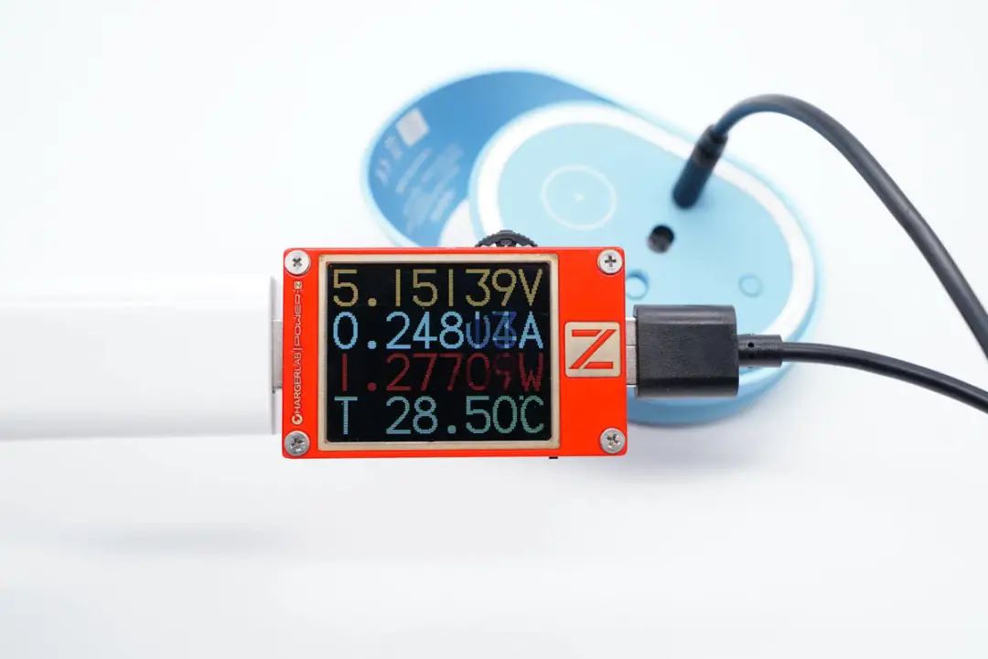 另外進(jìn)行有線(xiàn)充電測(cè)試,使用KT002可以測(cè)得充電功率為5.15V 0.25A 1.28W。