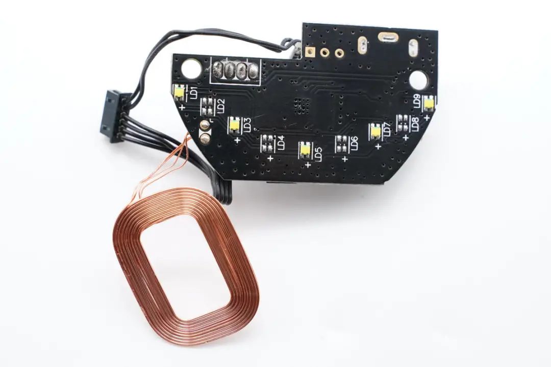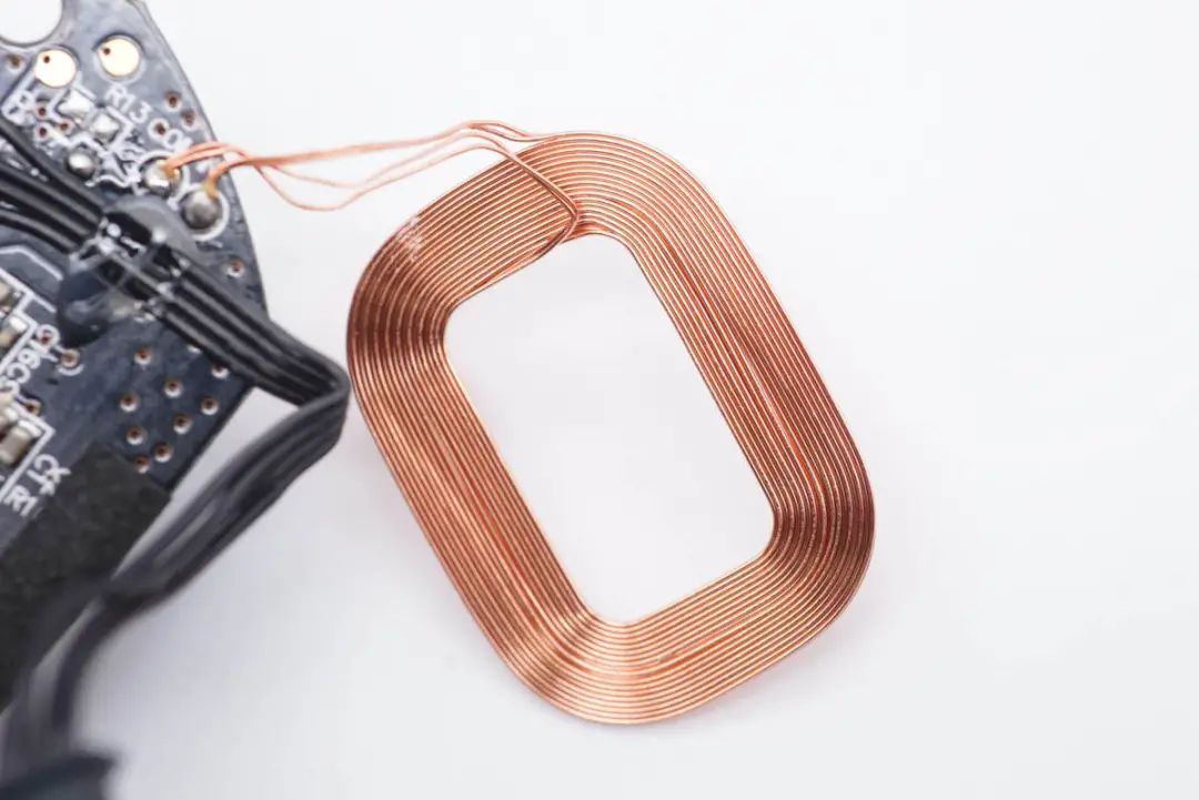 無(wú)線(xiàn)充電接收線(xiàn)圈特寫(xiě),漆包線(xiàn)繞制,隔磁片粘貼在電池上。