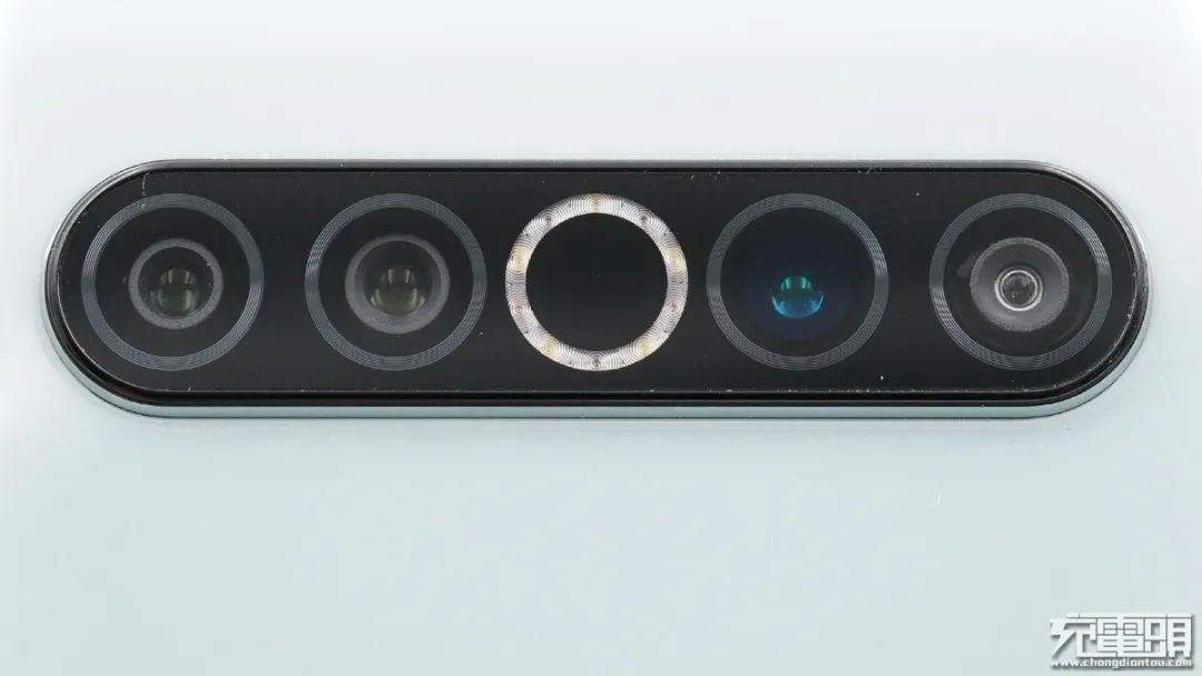 背面上端是6400W四攝全場景影像系統(tǒng),從左往右依次是長焦相機,廣角相機,3D深感探測器和超廣角相機,中間白色圓環(huán)為內(nèi)置閃光燈。