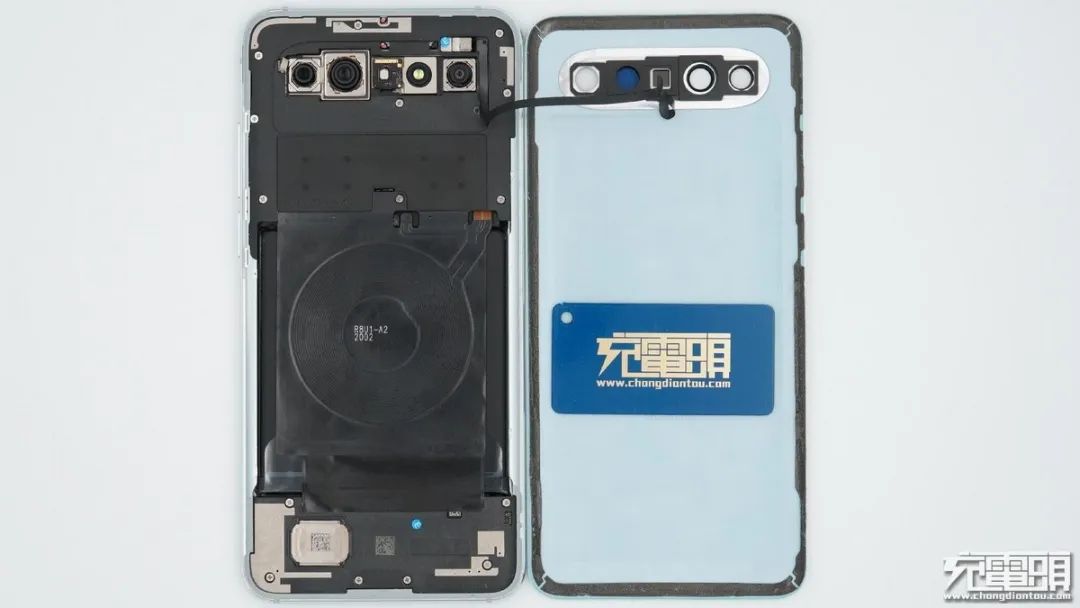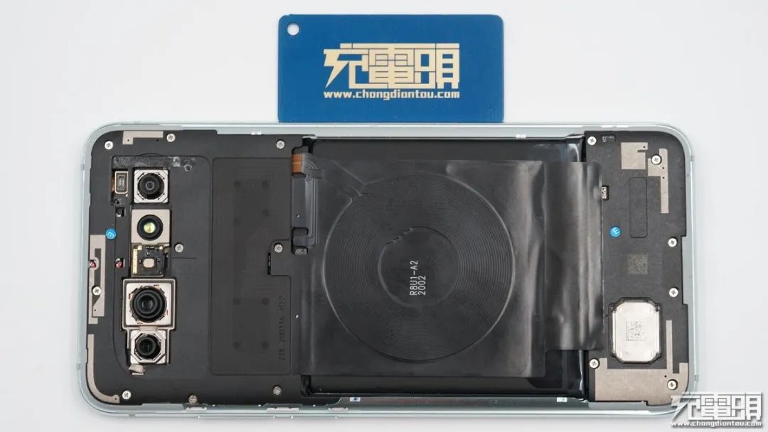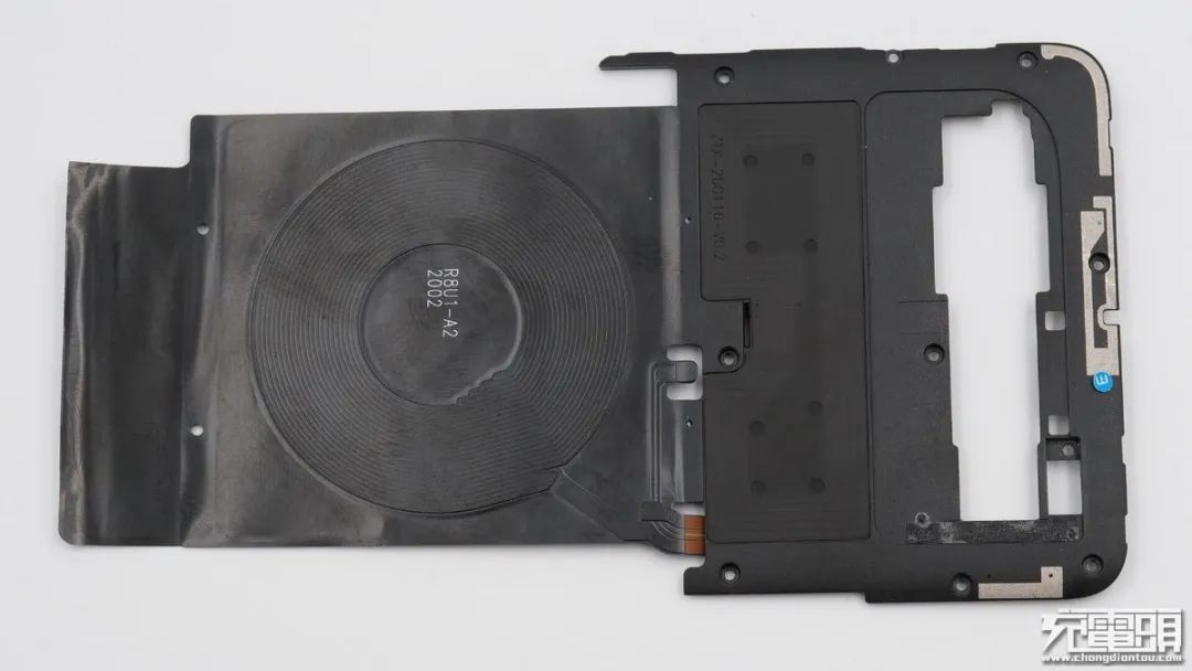 背面一覽,無線充電線圈與主板通過連接器連接,方形觸點為NFC線圈觸點。
