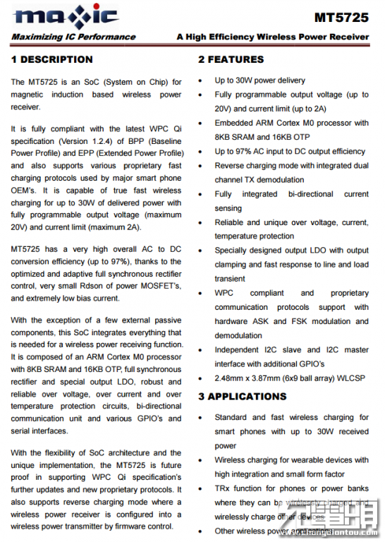 無線充接收芯片采用美芯晟MT5725。MT5725是一款基于磁感應(yīng)的SoC高集成無線充電接收芯片,集成了無線充電接收功能所需的一切,可提供高達30W的輸出功率。并具有非常高的整體AC/DC轉(zhuǎn)換效率(高達97%)。