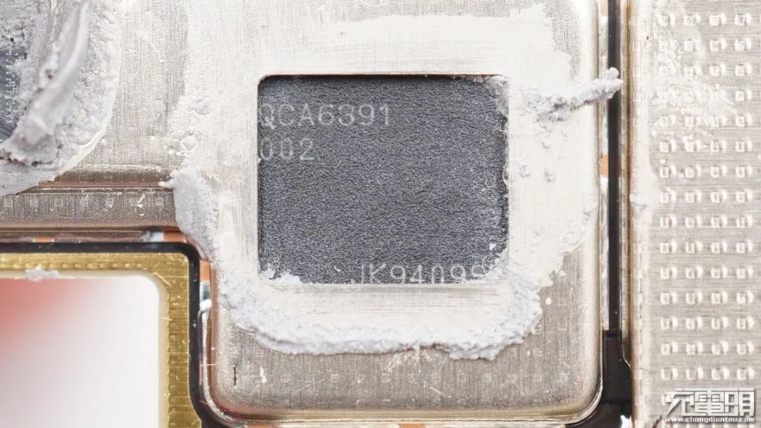 高通 SDX55M,第二代5G調(diào)制解調(diào)器,由導(dǎo)熱硅膠覆蓋散熱。