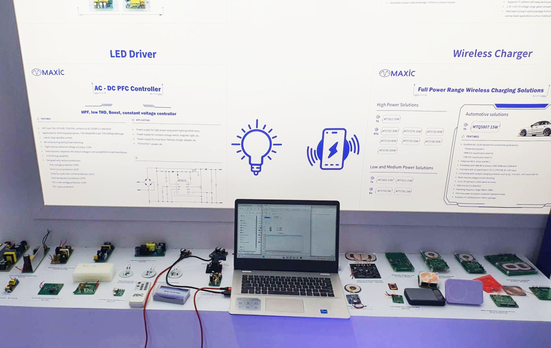 無線充電產(chǎn)品重點(diǎn)展示了全功率段無線充電解決方案,滿足大功率(專為手機(jī)無線充電而生的80W大功率Rtx芯片MT5786)、中小功率(15W All-in-One RTX/TX解決方案MT5706+MT5805)及車規(guī)級(jí)(15W車載無線充電芯片MTQ5807)等多功率段,適用TWS耳機(jī)、手表、電動(dòng)牙刷、手機(jī)、PAD、移動(dòng)電源、無線充電器、汽車電子等多終端產(chǎn)品應(yīng)用。
