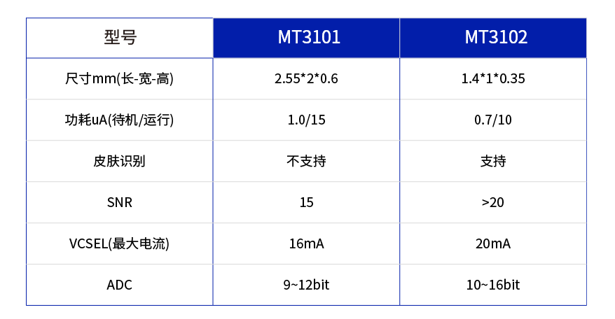美芯晟最新推出的MT3102是一款超小尺寸、超低功耗、集成940nm VCSEL的數(shù)字光學(xué)接近傳感器,封裝尺寸僅有1.4mm*1mm*0.35mm,待機(jī)功耗低至0.7uA,配有公司自研高精度皮膚識(shí)別算法,有效提升入耳檢測(cè)效率,識(shí)別率>98%@3mm,對(duì)于常規(guī)的非皮膚組織,如桌子,書(shū)本,衣服,金屬等誤識(shí)率<5%@3mm,主要應(yīng)用于 TWS/OWS等無(wú)線藍(lán)牙耳機(jī)、便攜式智能硬件產(chǎn)品、智能手表手機(jī)等。