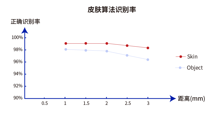 配有公司自研皮膚識(shí)別算法,在3mm距離下實(shí)現(xiàn)98%以上人體識(shí)別率,對(duì)于常規(guī)的非皮膚組織,如衣服(黑色/白色)、紙張(不同顏色)、桌面(木頭或金屬)、其他電子器件(塑料外殼)等物體實(shí)現(xiàn)95%以上識(shí)別率,有效提高可穿戴設(shè)備的佩戴檢測(cè)性能,提升用戶使用體驗(yàn)。