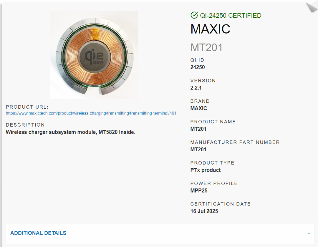 Maxic's independently developed wireless charging transmitter module MT201, with 25W output power, has obtained the latest Qi2.2.1 certification (Qi ID: 24250). With Maxic’s wireless charging transmitter MT5820, which can charge multiple devices simultaneously, the module supports BPP (5W), EPP (15W), and MPP (25W).
