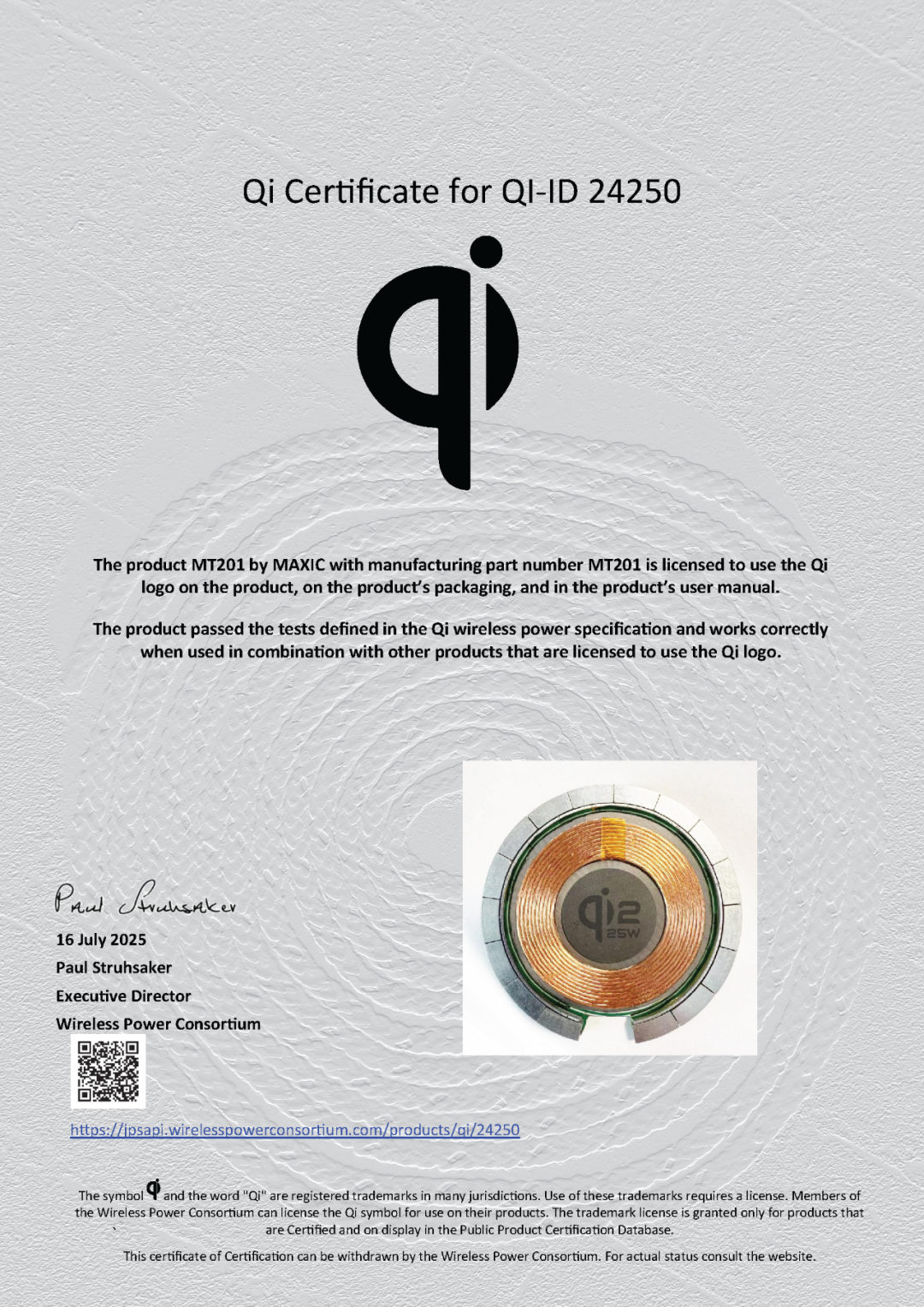 On June 16, 2025, the Wireless Power Consortium (WPC) officially launched the Qi2.2.1 standard. Recently, WPC announced the first batch of certified PTx products. Maxic’s MT201 module secured a place on the list, demonstrating the company’s leadership in core wireless charging technologies and its commitment to advancing new industry standards.